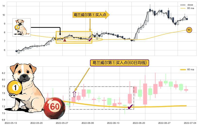 形态多维评估: ⚀ 2022-05-30-日显现 葛兰威尔均线 60日均线 第买①入点 走势反转见底信号,后市看涨,买进信号