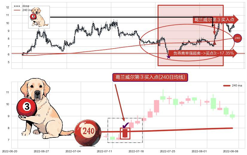 形态多维评估: ⚀ 2022-07-13-日显现 葛兰威尔均线 240日均线 第③买入点 上升趋势的中继信号,后市看涨,买进信号
