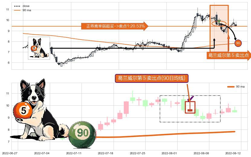 形态多维评估: ⚀ 2022-08-03-日显现 葛兰威尔均线 90日均线 第⑤卖出点 上升趋势均值回复的短线回落信号,后市看跌,卖出信号