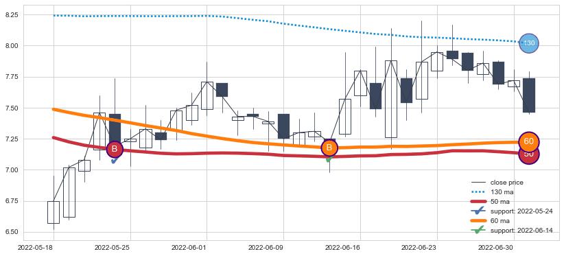 上涨趋势2022-05-18-2022-07-01,均线50, 60确认关键支撑2处