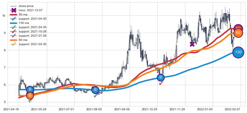 上涨趋势2021-04-16-2022-02-07,均线50, 60, 130确认关键支撑3处