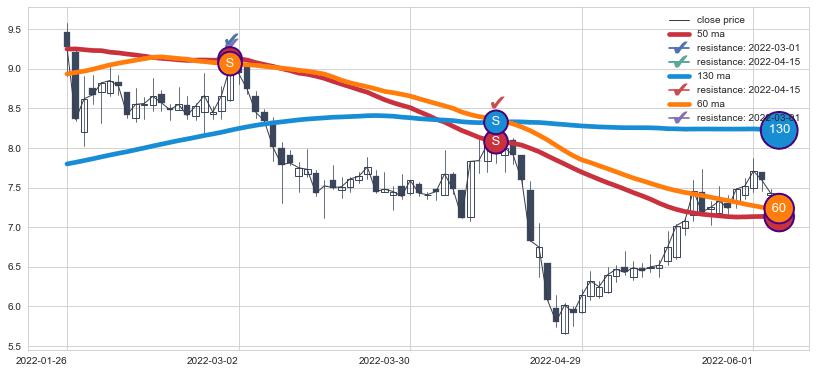 下跌趋势2022-01-26-2022-06-06,均线50, 60, 130确认关键阻力2处