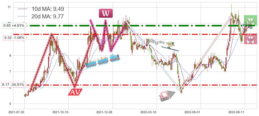 ♘ 阻力价格位9.85,可信任强度89.67%,距离最后交易2022-08-12形成的收盘价格9.42相差 +4.51%
