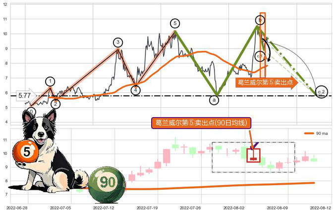 ➣ 🕰 价格走势在2022-07-29至2022-08-08期间形成葛兰威尔第⑤卖出点,残存影响值:-3.28