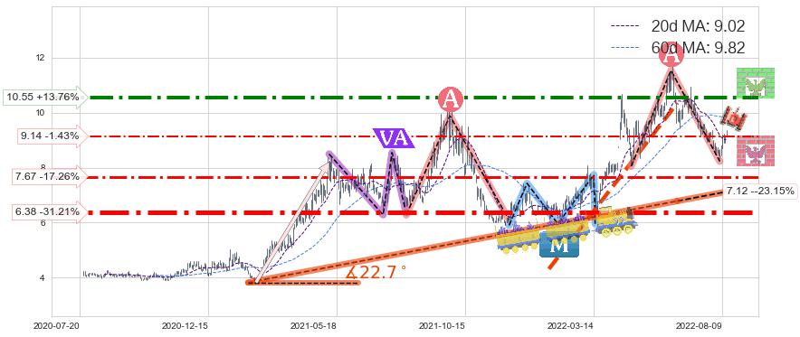 ♘ 支撑价格位9.14,可信任强度38.96%,距离最后交易2022-08-12形成的收盘价格9.27相差 -1.43%