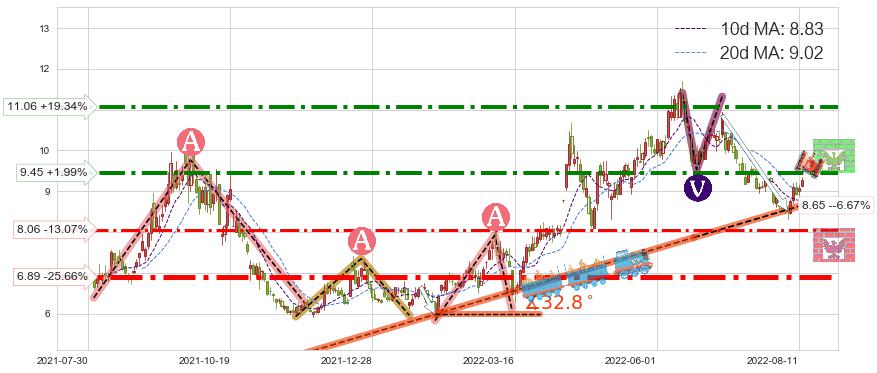 ♘ 支撑价格位8.06,可信任强度68.62%,距离最后交易2022-08-12形成的收盘价格9.27相差 -13.07%