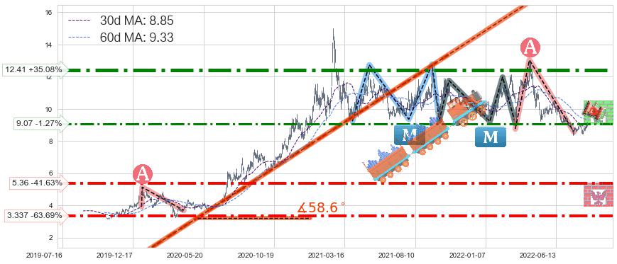 ♘ 支撑价格位5.36,可信任强度72.46%,距离最后交易2022-08-12形成的收盘价格9.19相差 -41.63%