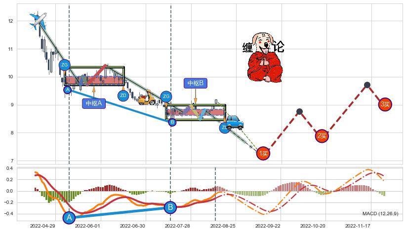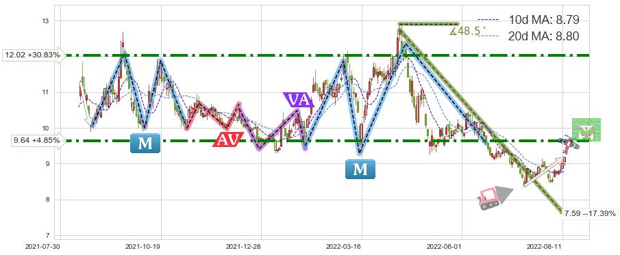 ➣ 【中枢B】:2022-07-25-2022-08-05,中枢由4笔构成,共10交易日, ZG=8.82, ZD=8.71