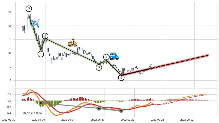 | 3 🅚:【蛟龙出海】买入点 ➕ 🌊:波浪理论猜想下跌浪5已形成,猜想后续形成abc反弹上涨(均值回复) ☞ 看多信号 ⇥ 【均线】交织【图形】⇥ 综合量化分数: 75 | > |