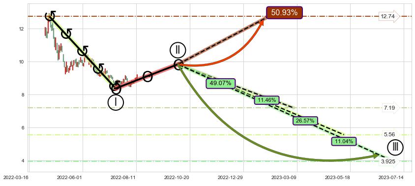 ➢ 循环浪继续向下【最低】位置(2023-07-14, 3.925),匹配聚类样本比例22.50%, 可能性概率11.04%