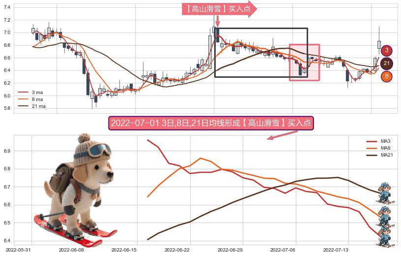 ⚀ 2022-06-16日-2022-07-18日显现 3日-8日-21日均线 【高山滑雪】买入点 看多信号,后市看涨,买入
