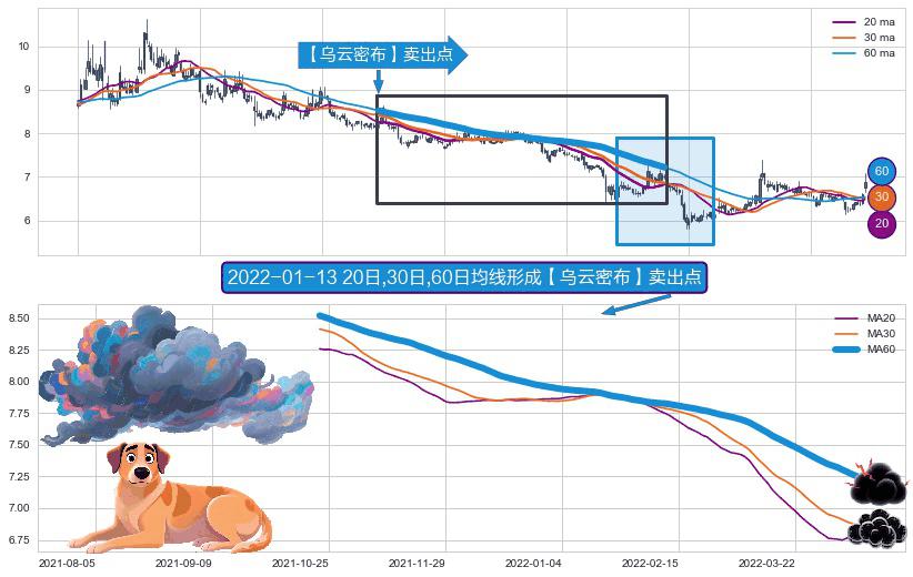 ⚀ 2021-10-21日-2022-04-14日显现 20日-30日-60日均线 【乌云密布】卖出点 看空信号,后市看跌,卖出