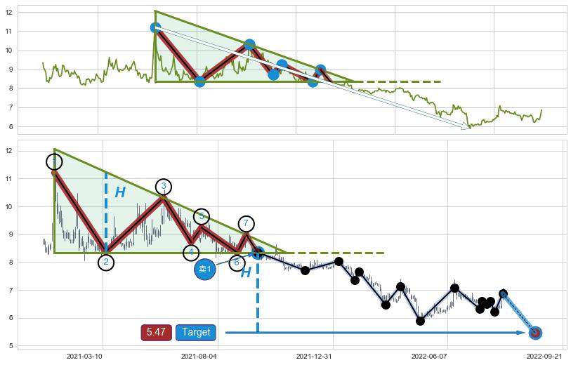 ➢ 【多方力量耗尽,空方打破攻守平衡点】下降三角形中继整理, 已在2021-09-24突破【支撑】颈线 8.35 →演变成下降通道