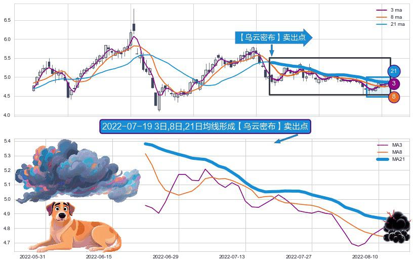形态多维评估: ⚀ 2022-06-22日-2022-08-12日显现 3日-8日-21日均线 【乌云密布】卖出点 看空信号,后市看跌,卖出
