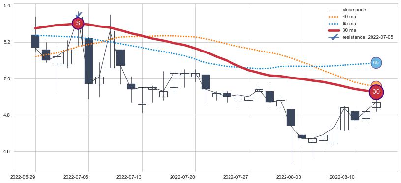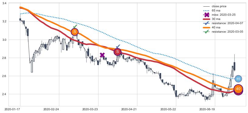 下跌趋势2020-01-17-2020-07-07,均线40, 30确认关键阻力2处