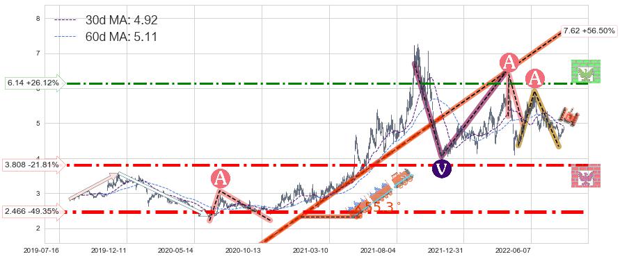 ♘ 阻力价格位6.14,可信任强度60.74%,距离最后交易2022-08-12形成的收盘价格4.87相差 +26.12%