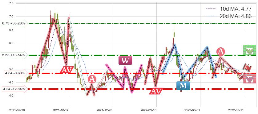 ♘ 支撑价格位4.84,可信任强度77.79%,距离最后交易2022-08-12形成的收盘价格4.87相差 -0.63%