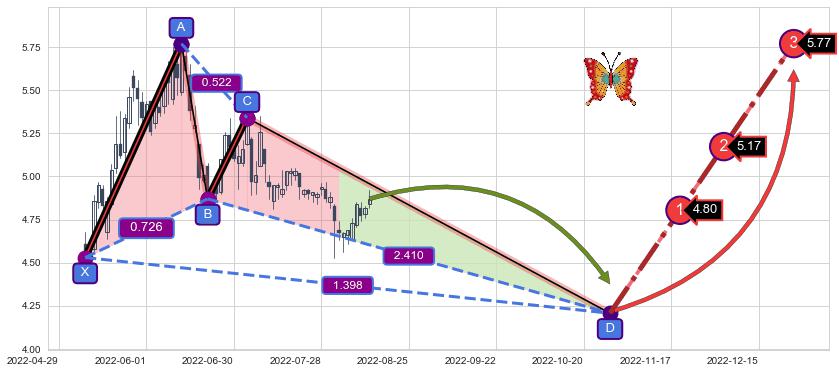 ➣ 未完成【蝴蝶】形态起点X: 2022-05-12, 已到达C点: 2022-07-05, 预测最终D点: 2022-10-28, 共114交易日