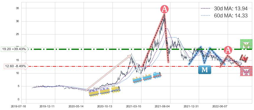 ♘ 阻力价格位19.20,可信任强度70.29%,距离最后交易2022-08-12形成的收盘价格13.77相差 +39.43%