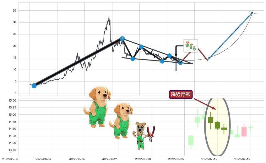 | 4 🅚:锤头线(锤子线) ➕ 📐:降楔型猜想突破点临近,临近关键阻力位,预期拉升突破上涨 ☞ 看多信号 ⇥ 【🅚线】交织【图形】⇥ 综合量化分数: 57 | > |