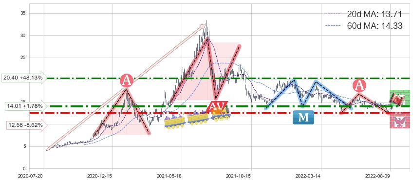 ♘ 阻力价格位20.40,可信任强度55.81%,距离最后交易2022-08-12形成的收盘价格13.77相差 +48.13%