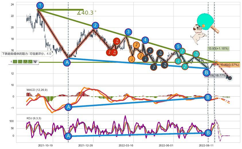 🦴 长线均值回复组合短线趋势跟踪[强阻力信号]2021-09-13-2022-08-11下跌趋势依然成立(下跌趋势跟踪依然存在),短线价格略微上行反弹(均值回复猜想),即将接近下跌趋势提供的未破位阻力价格:13.93。