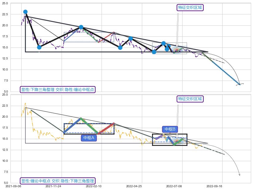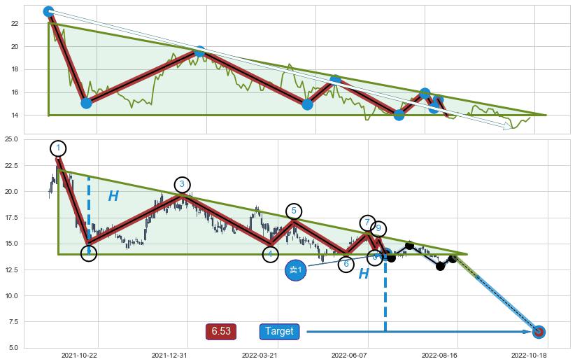 ➢ 【多方力量耗尽,空方打破攻守平衡点】下降三角形中继整理, 已在2022-06-21突破【支撑】颈线 13.99 →演变成下降通道