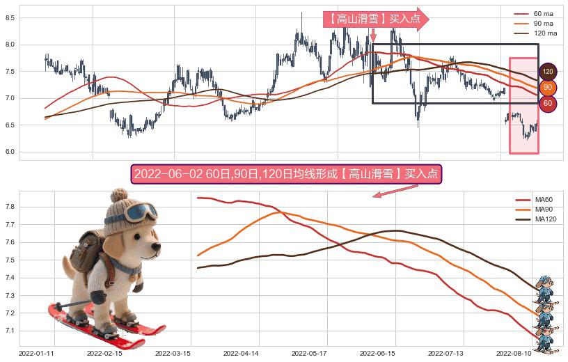 ⚀ 2022-03-17日-2022-08-12日显现 60日-90日-120日均线 【高山滑雪】买入点 看多信号,后市看涨,买入