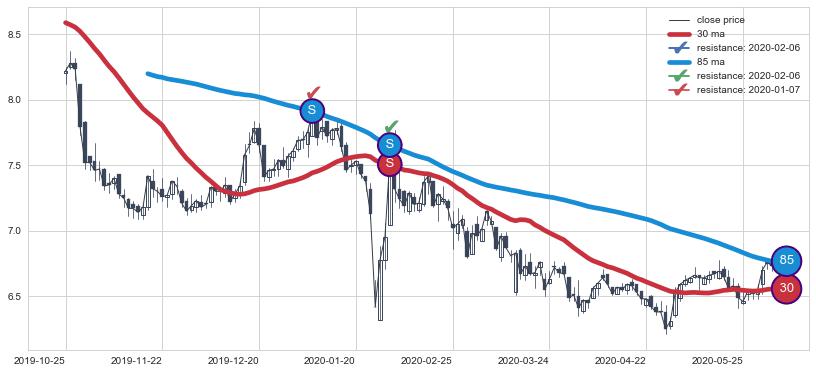 ➢ 最优均线组合共正确确认支撑阻力信号4处,正确确认率 80.00%