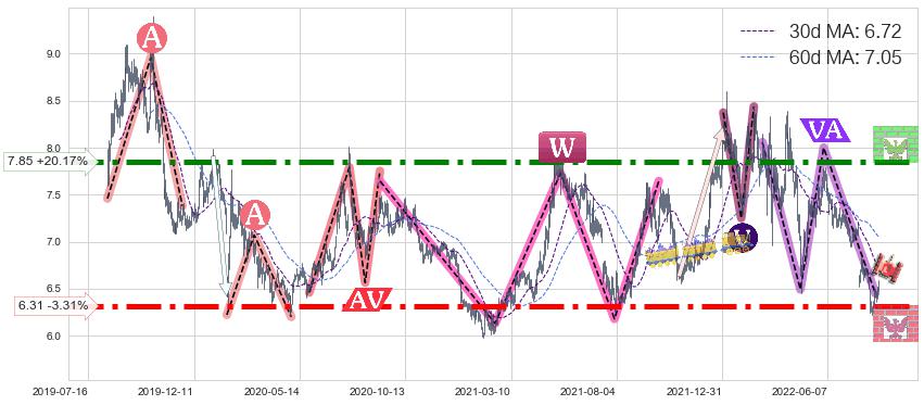 ♘ 阻力价格位7.85,可信任强度97.58%,距离最后交易2022-08-12形成的收盘价格6.53相差 +20.17%