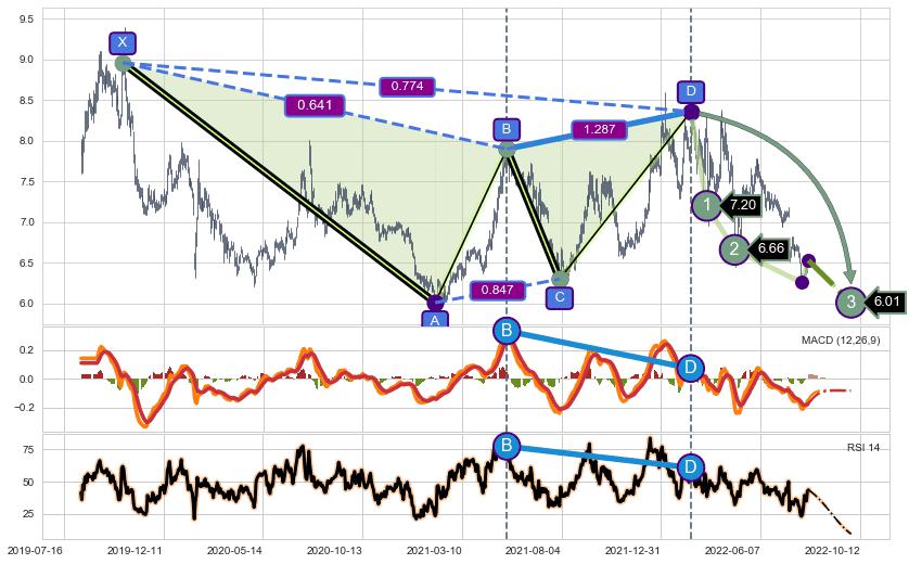 ➢ 谐波价格D点比B点高 ⤴,【MACD】指标D点比B点低 ⤵️