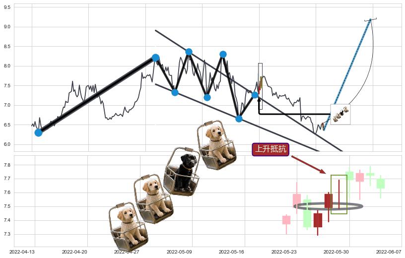 | 3 🅚:降势受阻 ➕ 📐:降楔型向上突破击穿阻力位, 猜想持续拉升上涨,被突破的阻力位已变为支撑位 ☞ 看多信号 ⇥ 【🅚线】交织【图形】⇥ 综合量化分数: 58 | > |
