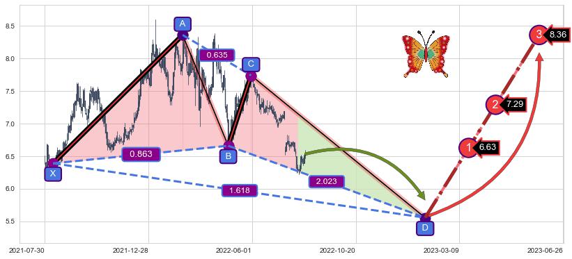 ➣ 未完成【蝴蝶】形态起点X: 2021-08-11, 已到达C点: 2022-05-31, 预测最终D点: 2023-01-23, 共353交易日