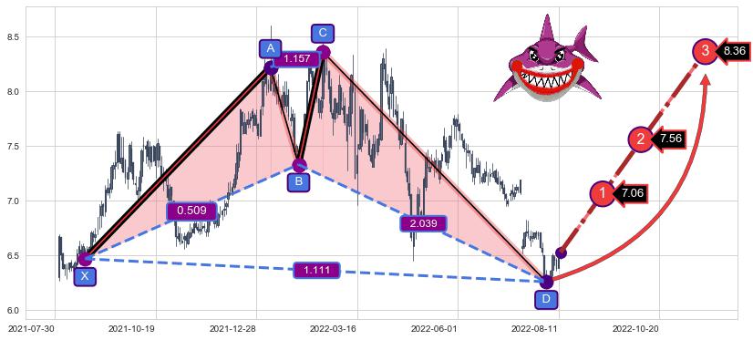 ➣ 已完成【鲨鱼】形态起点X: 2021-08-20, 终点D: 2022-08-03, 共230交易日