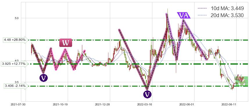 ♘ 阻力价格位3.925,可信任强度79.60%,距离最后交易2022-08-12形成的收盘价格3.480相差 +12.77%