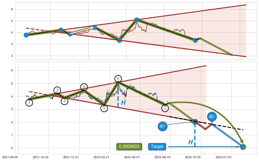 ➢ 最小反转跌幅→𝐇: 1.9546 (逐步抬高阻力斜边最后的阻力点⑥与支撑边垂直距离)