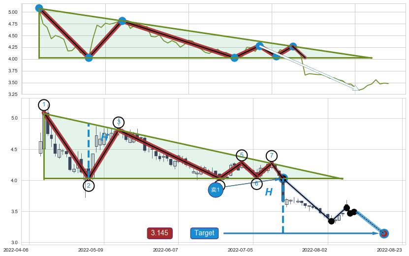 ➢ 【多方力量耗尽,空方打破攻守平衡点】下降三角形中继整理, 已在2022-07-15突破【支撑】颈线 4.03 →演变成下降通道