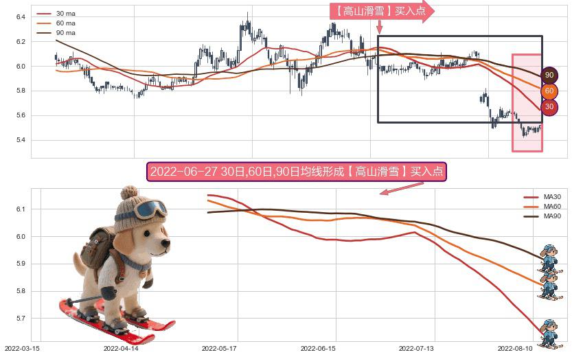 形态多维评估: ⚀ 2022-05-09日-2022-08-12日显现 30日-60日-90日均线 【高山滑雪】买入点 看多信号,后市看涨,买入