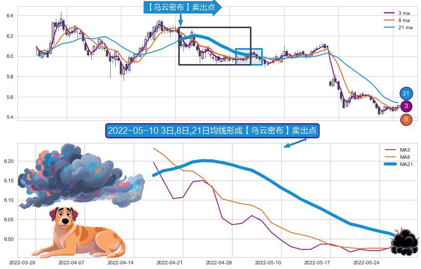 形态多维评估: ⚀ 2022-04-18日-2022-05-26日显现 3日-8日-21日均线 【乌云密布】卖出点 看空信号,后市看跌,卖出
