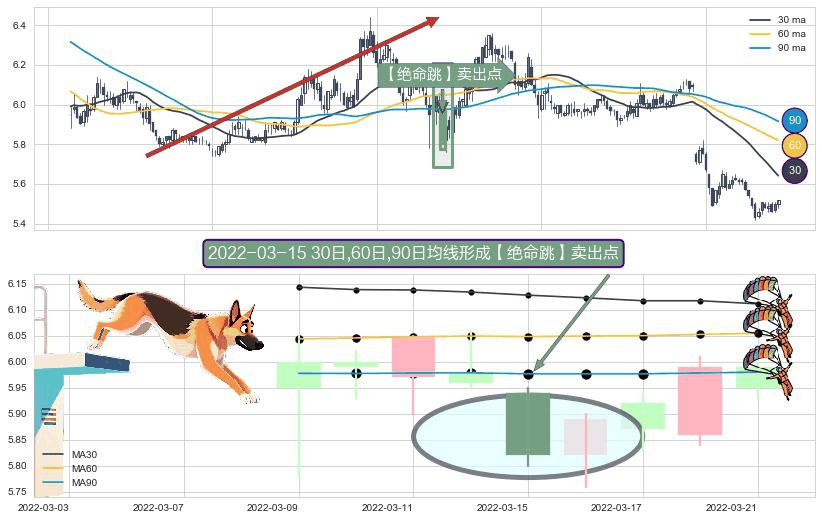 形态多维评估: ⚀ 2022-03-15日显现 30日-60日-90日均线 【绝命跳】卖出点 看空信号,后市看跌,卖出