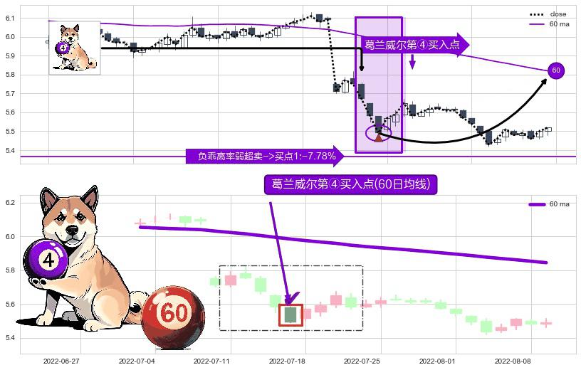 形态多维评估: ⚀ 2022-07-15-日显现 葛兰威尔均线 60日均线 第④买入点 下降趋势均值回复的短线反弹信号,后市看涨,买进信号