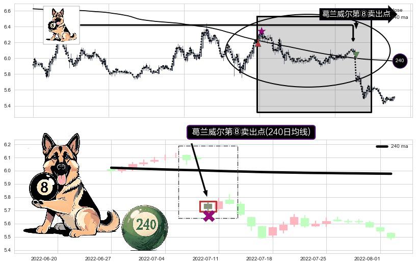 形态多维评估: ⚀ 2022-07-08-日显现 葛兰威尔均线 240日均线 第⑧卖出点 下降趋势的中继信号,后市看跌,卖出信号
