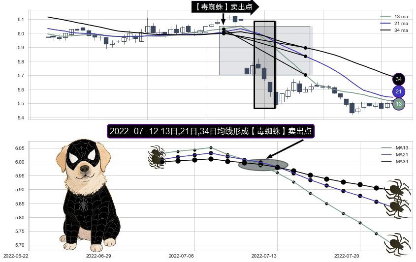 形态多维评估: ⚀ 2022-07-12日显现 13日-21日-34日均线 【毒蜘蛛】卖出点 看空信号,后市看跌,卖出