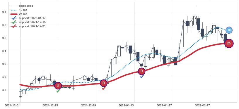 上涨趋势2021-12-01-2022-02-23,均线25确认关键支撑3处