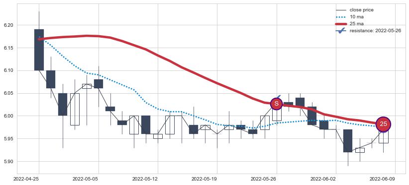 下跌趋势2022-04-25-2022-06-09,均线25确认关键阻力1处