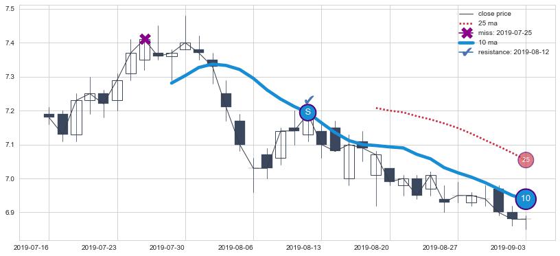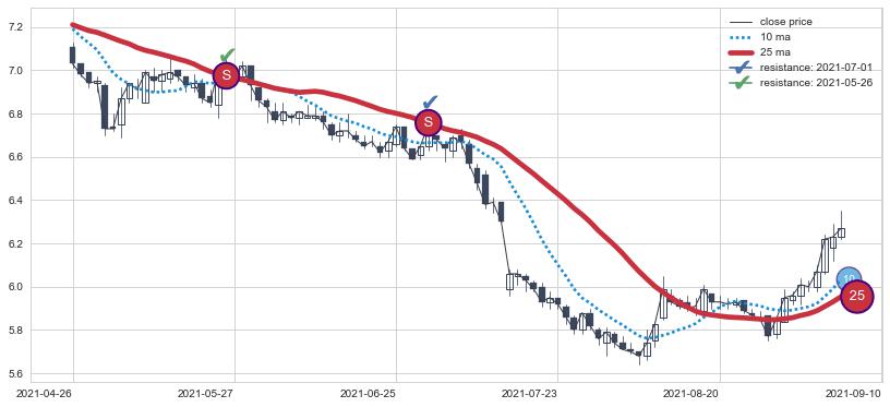 下跌趋势2021-04-26-2021-09-10,均线25确认关键阻力2处