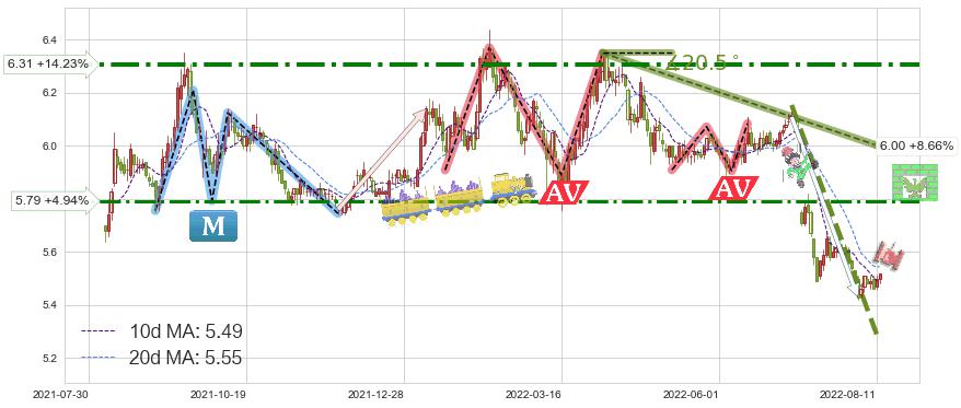 ♘ 阻力价格位6.31,可信任强度82.28%,距离最后交易2022-08-12形成的收盘价格5.52相差 +14.23%