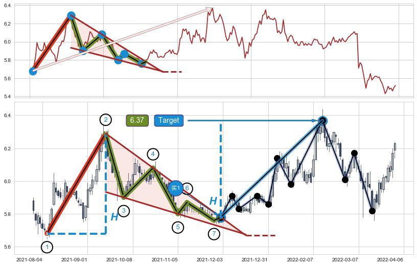 ➢ 【买1】: 激进型 买点 →(2021-12-02: 5.78 )形成突破降🚩楔型【整理】形态