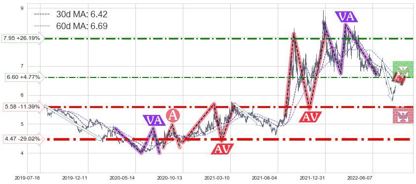 ♘ 阻力价格位6.60,可信任强度44.43%,距离最后交易2022-08-12形成的收盘价格6.30相差 +4.77%