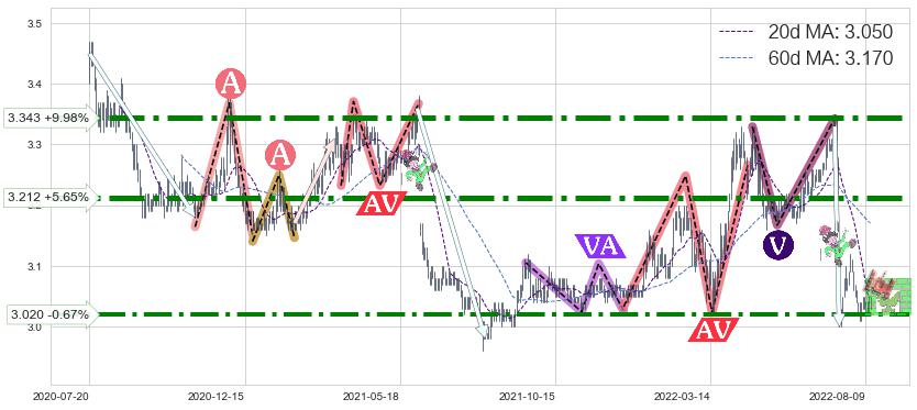♘ 阻力价格位3.020,可信任强度76.44%,距离最后交易2022-08-12形成的收盘价格3.040相差 -0.67%